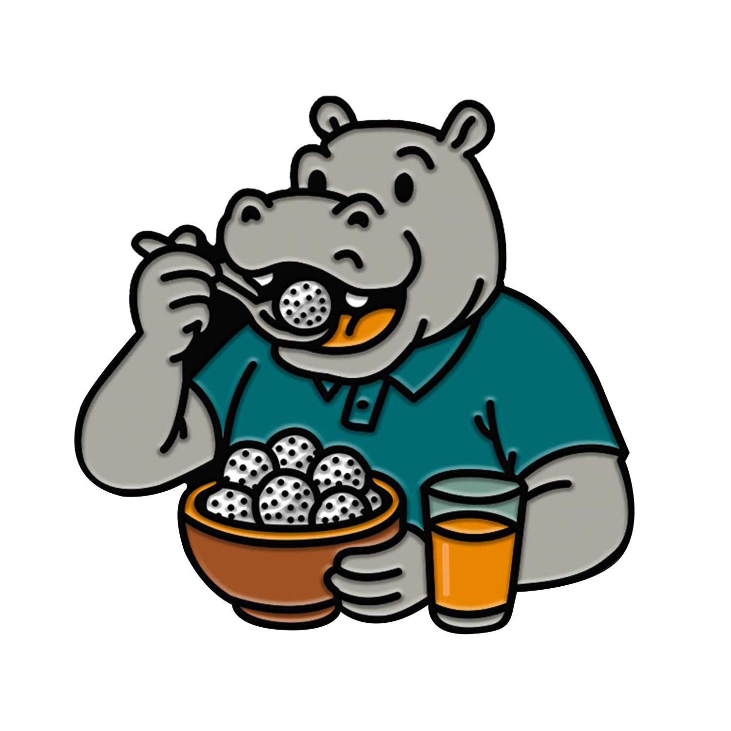 Inspired by the classic Hungry Hungry Hippos game, this enamel ball marker features our hippo buddy digging into a bowl of “breakfast balls.” With a spoonful of golf balls and a glass of OJ at his side, he’s the perfect reminder that sometimes a do-over is part of the fun. Whether you call it a mulligan or a breakfast ball, this playful design brings humor to your game.