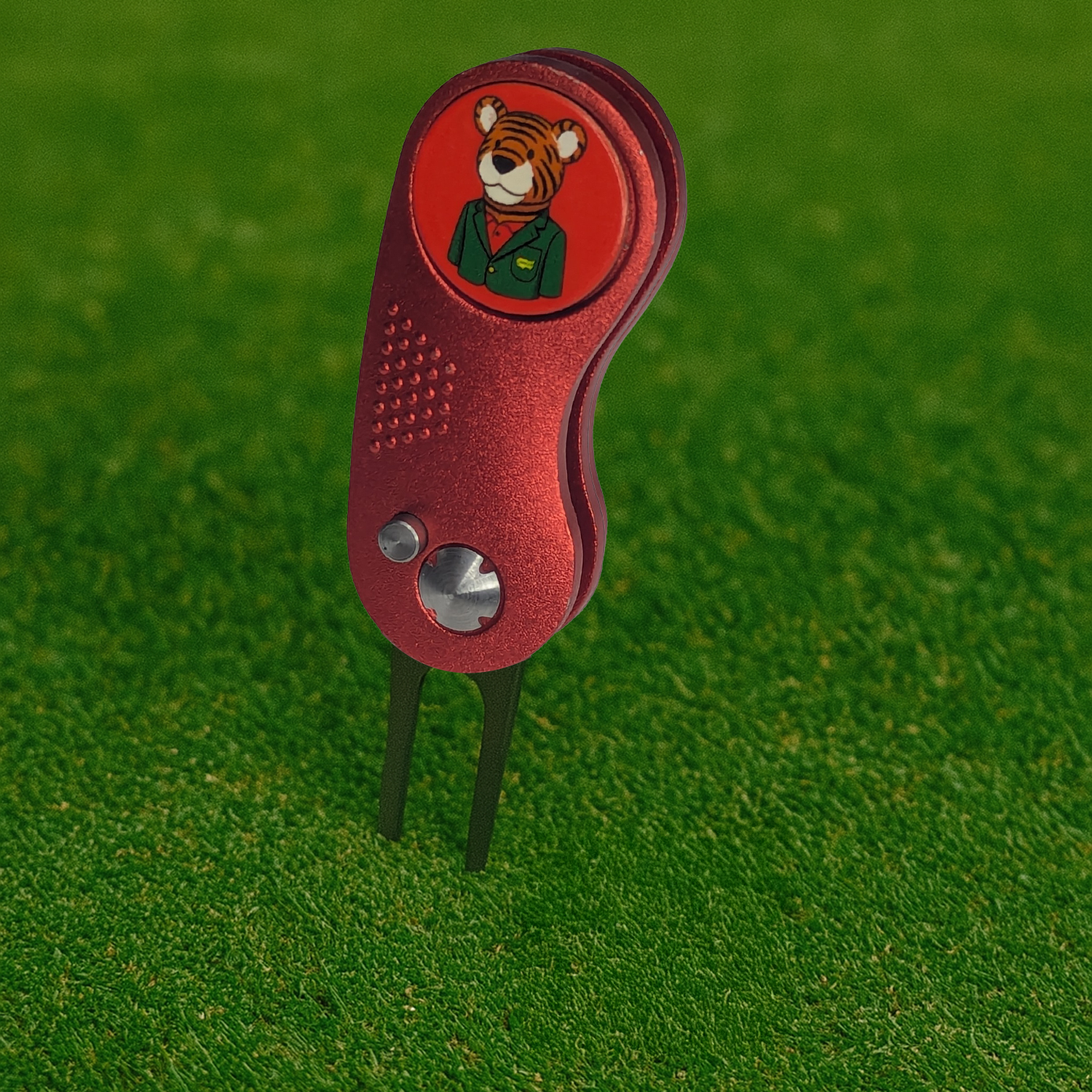 Fix your ball marks in style with this switchblade divot tool featuring “Frank” — the dapper tiger who means business on the green. The deep red anodized aluminum body is durable yet lightweight, and the spring-action fork tucks away for safe pocket carry. Complete with a magnetic ball marker that snaps in and out with ease, this tool combines character and functionality for golfers who stand out.