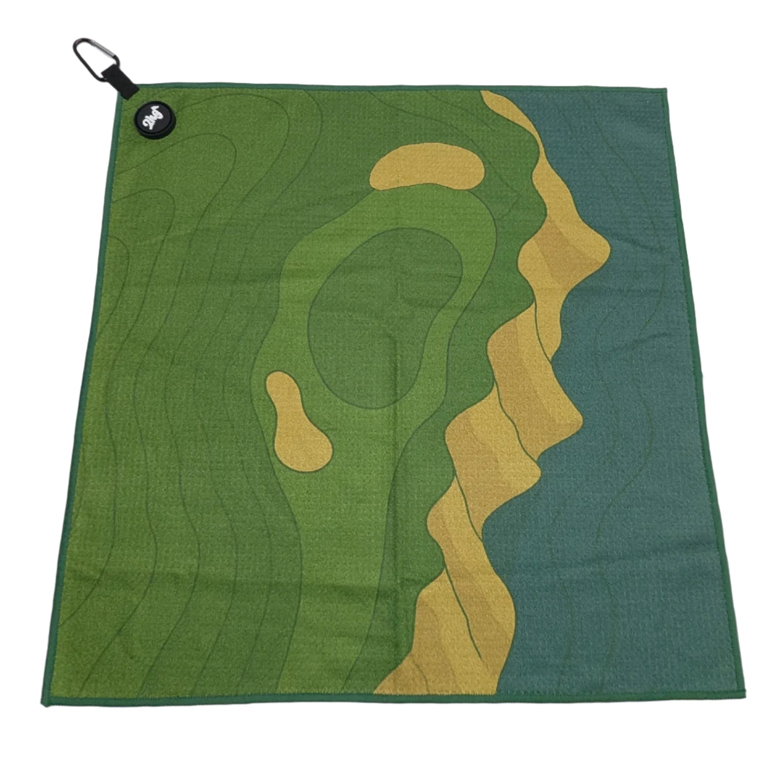 Play along the edge of the map with Oceanview — a fictitious seaside hole designed in clean topographic detail. Rolling fairways meet jagged coastline, with sandy bunkers guarding the green. The ocean-blue and earth-tone palette gives this towel a premium look on your bag, while the strong built-in magnet keeps it locked to your cart or clubs through every shot.
